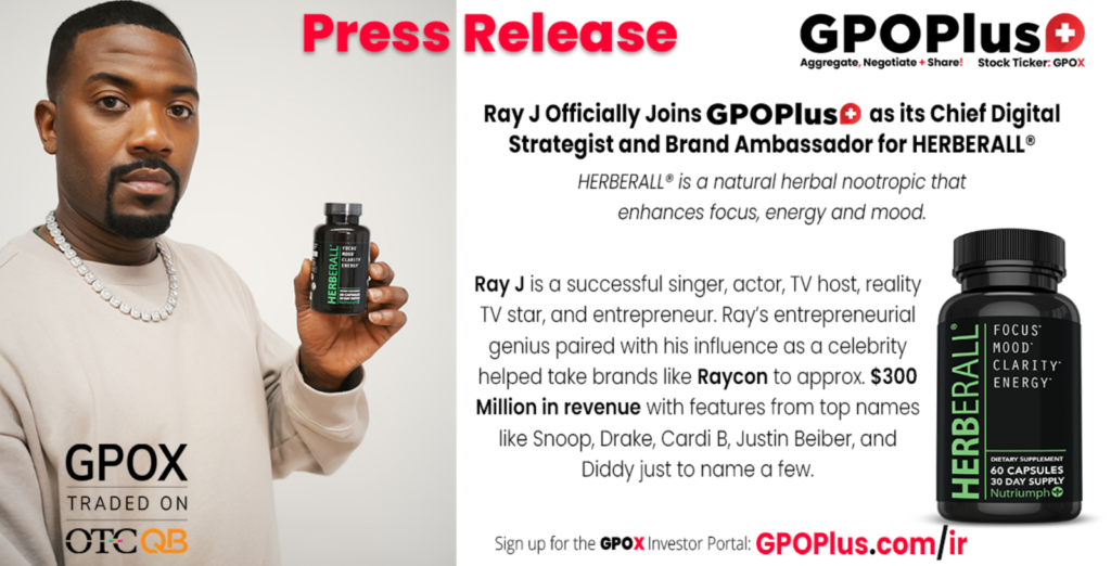 Las Vegas, NV (February 14, 2023) GPO Plus, Inc. (OTCQB: GPOX), a leading manufacturing and distribution company that develops consumer branded products for specialty retailers and online eCommerce sales, announced they entered into an Agreement with Ray J as Chief Digital Strategist for GPOX and Brand Ambassador for HERBERALL®. Ray J is joining the GPOX team to develop an influencer-driven campaign to brand, market, promote and publicize the business of GPOX and HERBERALL®.